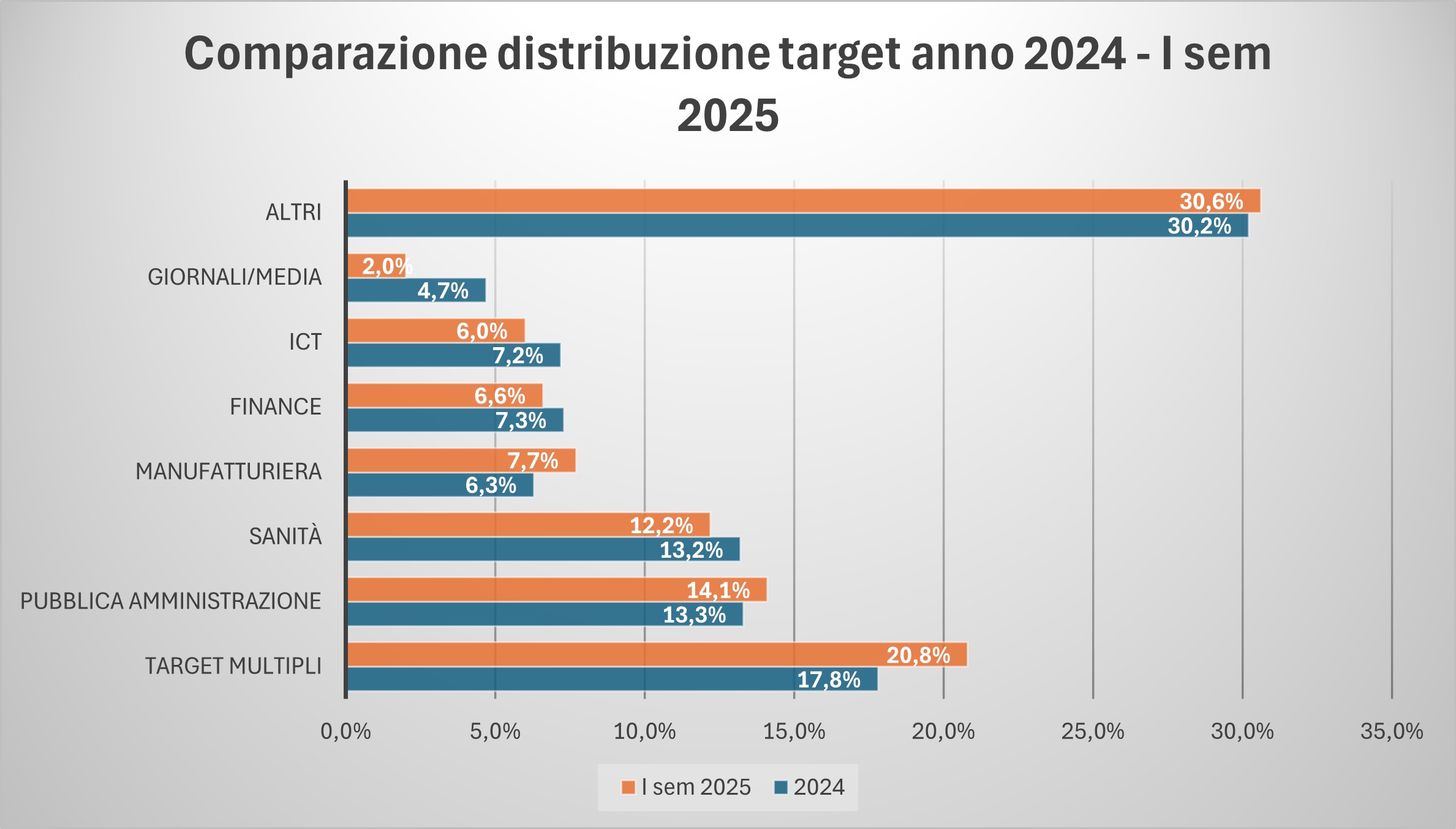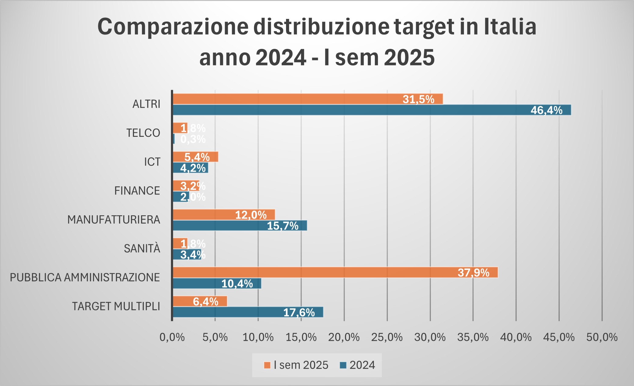 Per quanto riguarda i target invece, si confermano i primati della Pubblica Amministrazione (Civile e Militare), con un aumento del 0,8%.
