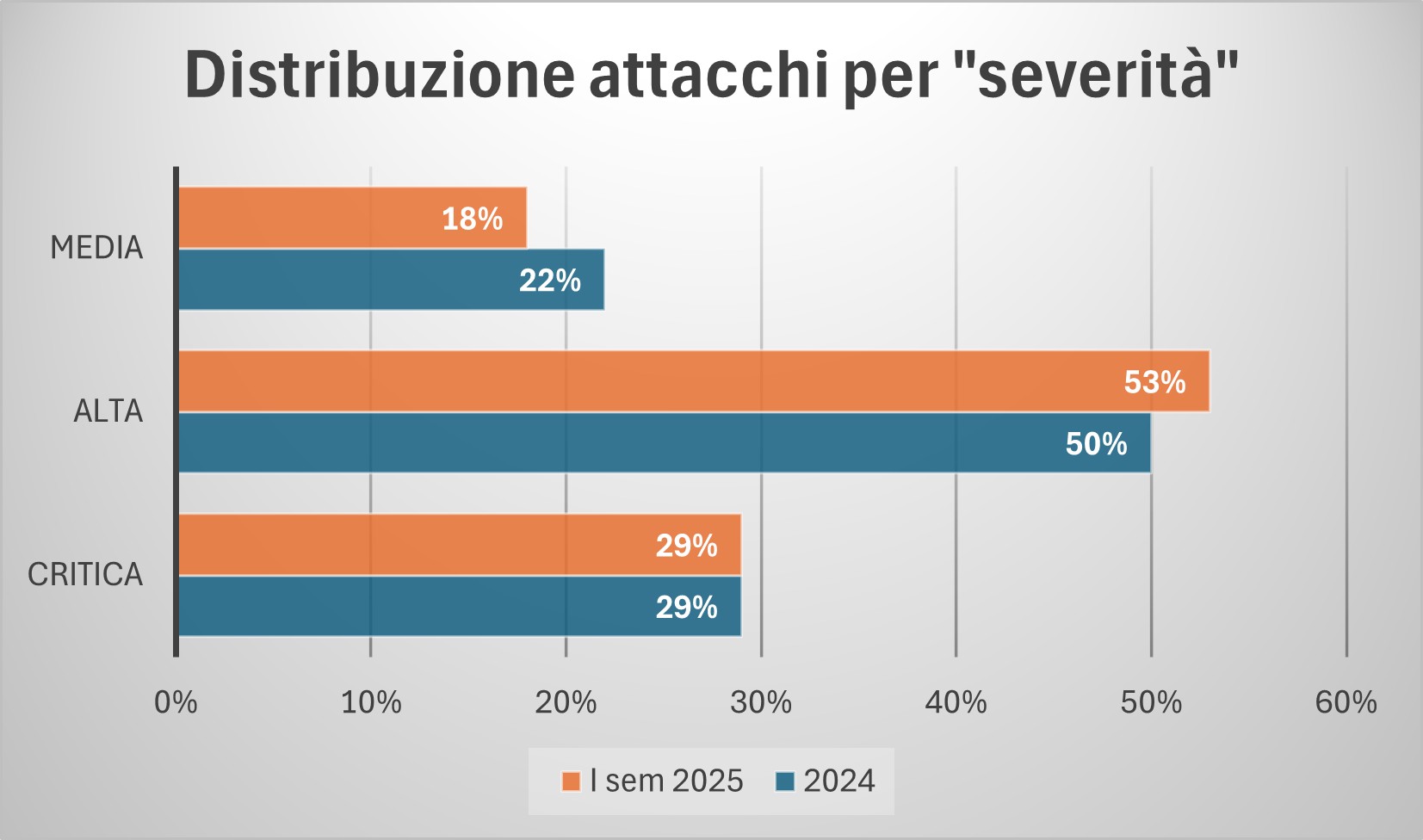 Per quanto riguarda la severità degli attacchi con impatti significativi (Media, Alta o Critica), si confermano il numero di impatti critici, mentre diminuiscono in percentuale quelli a criticità Alta.