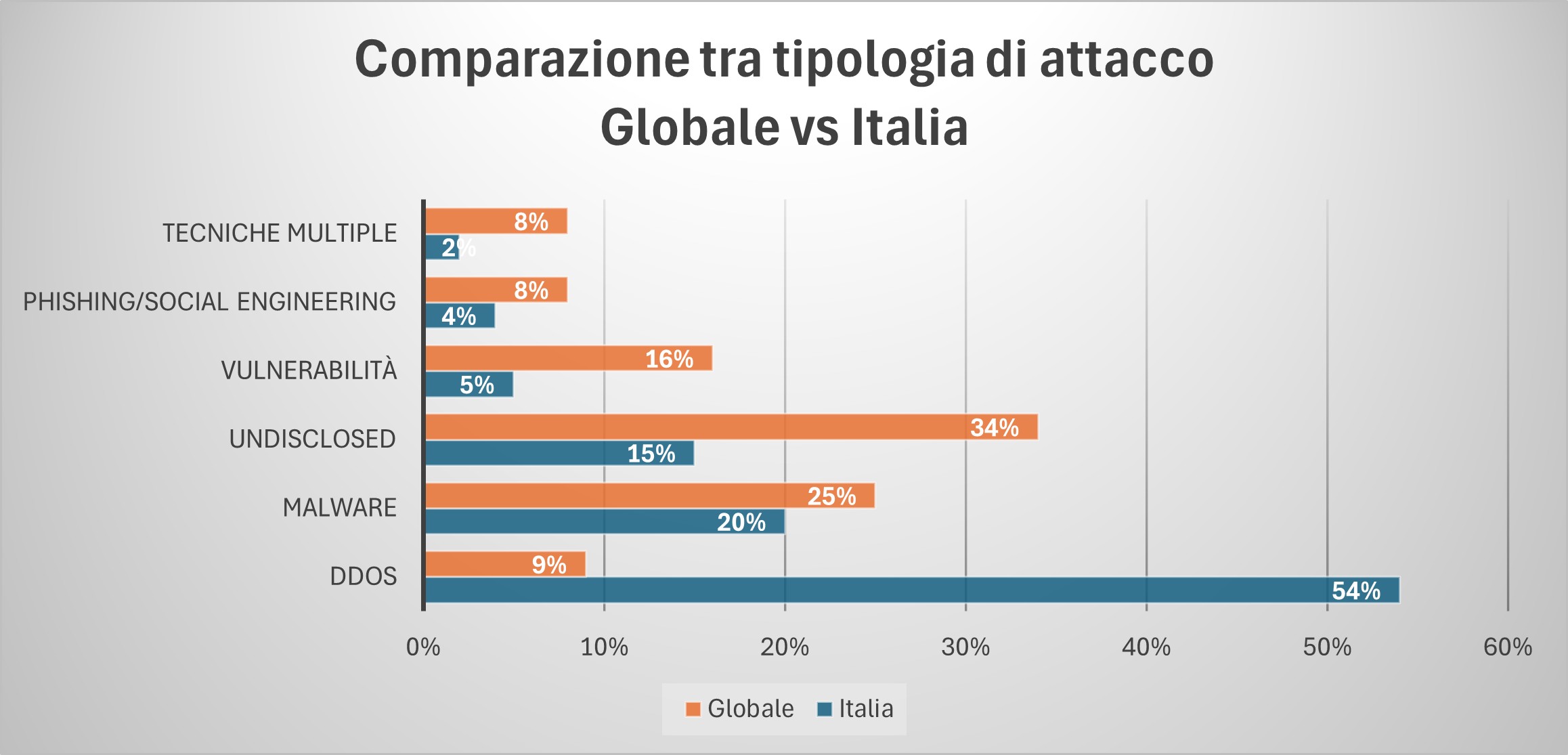 In Italia il numero di attacchi di tipo DDoS è cinque volte più alto di quelli riscontrati nel resto del mondo. Gli attacchi di tipo DDoS, quindi, si riprendono il primo posto in classifica come già avvenuto nel 2023 (inizio della guarra in Ucraina), attestandosi al 54%. Questo tipo di attacchi è tipico dell'hacktivismo, e lo scopo è richiamare l’attenzione sulla loro causa e l’interruzione di servizi può essere un mezzo efficace per rendere evidente al pubblico il proprio messaggio di protesta.
